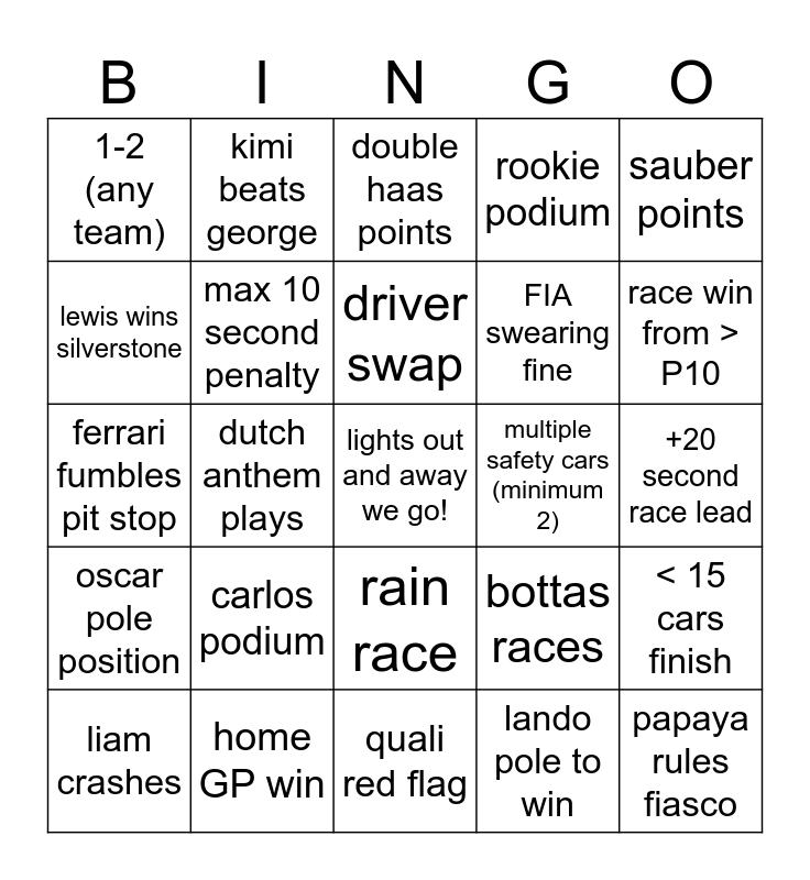 This bingo card has a free space and 24 words: carlos podium, home GP win, driver swap, liam crashes, sauber points, 1-2 (any team), lewis wins silverstone, kimi beats george, multiple safety cars (minimum 2), rain race, FIA swearing fine, ferrari fumbles pit stop, bottas races, < 15 cars finish, max 10 second penalty, lando pole to win, +20 second race lead, double haas points, race win from > P10, dutch anthem plays, papaya rules fiasco, oscar pole position, rookie podium and quali red flag.