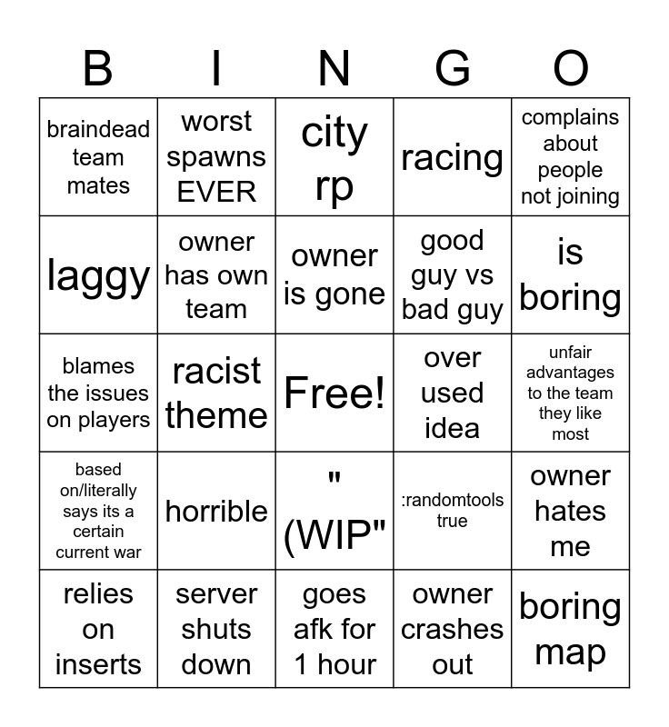 This bingo card has a free space and 24 words: horrible, server shuts down, owner is gone, relies on inserts, complains about people not joining, braindead team mates, laggy, worst spawns EVER, over used idea, "(WIP", good guy vs bad guy, blames the issues on players, :randomtools true, owner hates me, owner has own team, owner crashes out, unfair advantages to the team they like most, city rp, is boring, racist theme, boring map, based on/literally says its a certain current war, racing and goes afk for 1 hour.