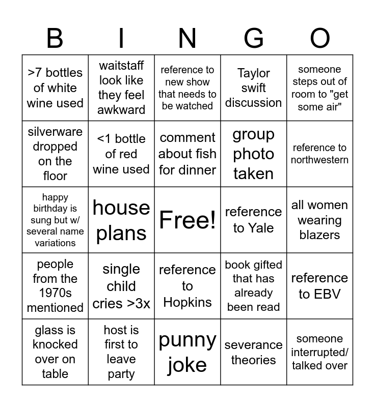 This bingo card has a free space and 24 words: single child cries >3x, host is first to leave party, comment about fish for dinner, glass is knocked over on table, someone steps out of room to "get some air", >7 bottles of white wine used, silverware dropped on the floor, waitstaff look like they feel awkward, reference to Yale, reference to Hopkins, group photo taken, happy birthday is sung but w/ several name variations, book gifted that has already been read, reference to EBV, <1 bottle of red wine used, severance theories, all women wearing blazers, reference to new show that needs to be watched, reference to northwestern, house plans, someone interrupted/ talked over, people from the 1970s mentioned, Taylor swift discussion and punny joke.