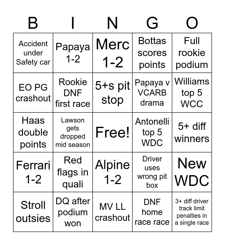 This bingo card has a free space and 27 words: Driver uses wrong pit box, Tsunodium, Papaya v VCARB drama, MV LL crashout, EO PG crashout, Merc 1-2, Papaya 1-2, Ferrari 1-2, Antonelli top 5 WDC, New WDC, Haas double points, Bottas scores points, Stroll outsies, DQ after podium won, Williams top 5 WCC, Rookie podium first 5 races, Rookie DNF first race, 5+s pit stop, Red flags in quali, Accident under Safety car, 5+ diff winners, DNF home race race, Lawson gets dropped mid season, 3+ diff driver track limit penalties in a single race, Alpine 1-2, Full rookie podium and Double red flag.