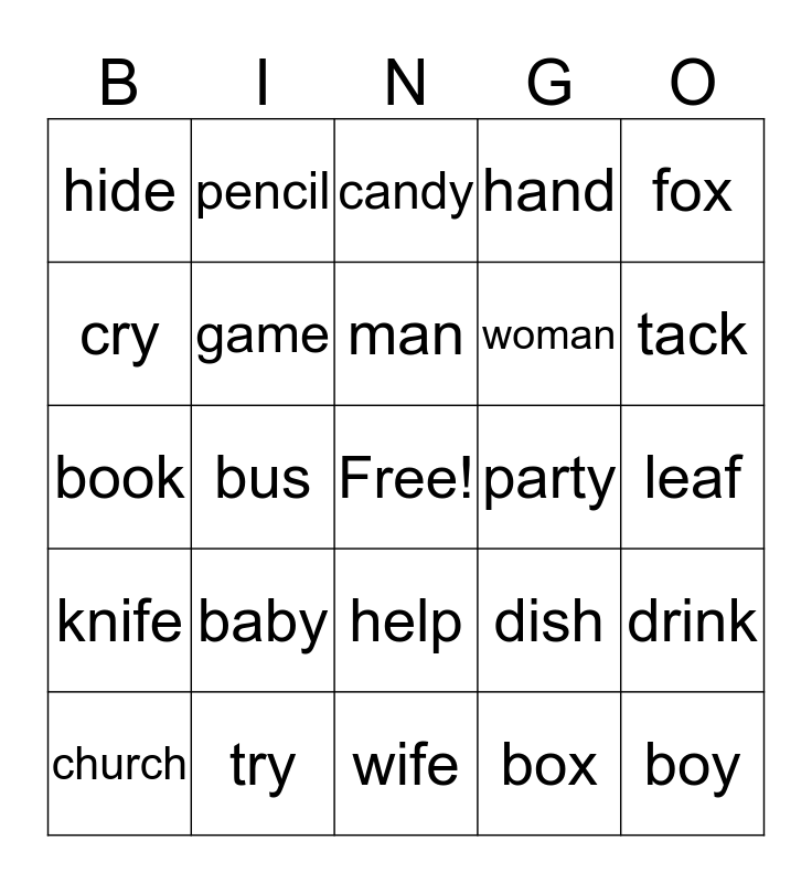 This bingo card has a free space and 24 words: baby, try, man, church, fox, hide, cry, pencil, party, help, woman, book, dish, drink, game, box, leaf, candy, tack, bus, boy, knife, hand and wife.