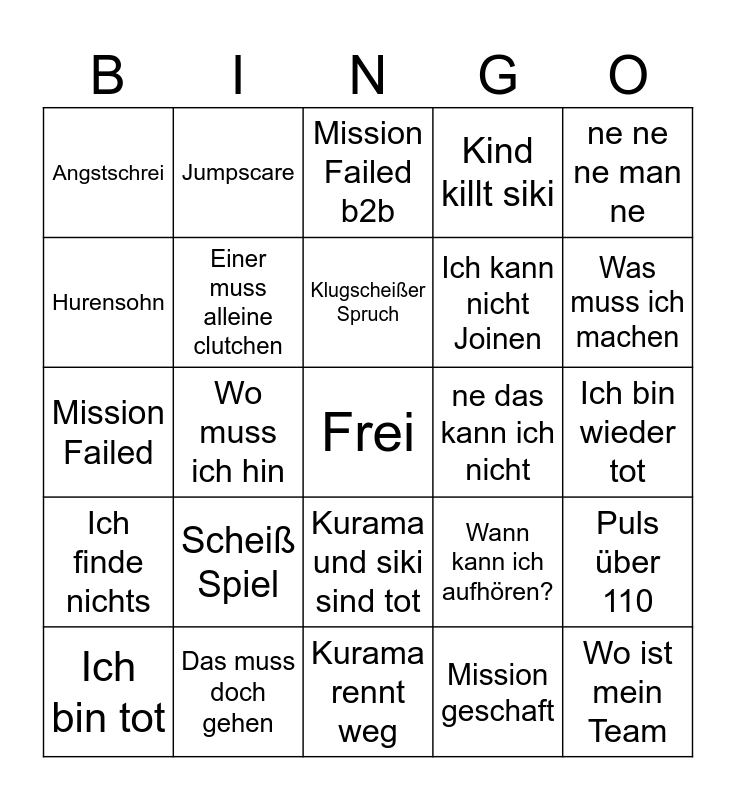 This bingo card has a free space and 24 words: Scheiß Spiel, Das muss doch gehen, Klugscheißer Spruch, Ich bin tot, ne ne ne man ne, Angstschrei, Hurensohn, Jumpscare, ne das kann ich nicht, Kurama und siki sind tot, Ich kann nicht Joinen, Mission Failed, Wann kann ich aufhören?, Puls über 110, Einer muss alleine clutchen, Mission geschaft, Ich bin wieder tot, Mission Failed b2b, Was muss ich machen, Wo muss ich hin, Wo ist mein Team, Ich finde nichts, Kind killt siki and Kurama rennt weg.