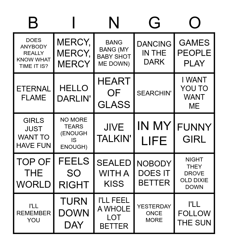 This bingo card has 80 words: AMONG MY SOUVENIRS, BABY, WHAT A BIG SURPRISE, BANG BANG (MY BABY SHOT ME DOWN), BEAT ME DADDY, EIGHT TO THE BAR, BEND ME, SHAPE ME, BIGGEST PART OF ME, BILBAO SONG, BRICK HOUSE, BRING IT ON HOME TO ME, BURN THE CANDLE, CAN'T GET ENOUGH OF YOUR LOVE, BABE, COME BACK WHEN YOU GROW UP, DANCING IN THE DARK, DOES ANYBODY REALLY KNOW WHAT TIME IT IS?, DON'T FENCE ME IN, ETERNAL FLAME, EVERYBODY'S TALKING, FEELS SO RIGHT, FOREVER, FUNNY GIRL, FUNNY WAY OF LAUGHIN', GAMES PEOPLE PLAY, GIRLS JUST WANT TO HAVE FUN, HEART OF GLASS, HELLO DARLIN', HOLD YOUR HEAD UP, HOME, THE HOUSE THAT JACK BUILT, I FEEL THE EARTH MOVE, I GOTTA FEELING, I WANT YOU TO WANT ME, I WRITE THE SONG, I'LL FEEL A WHOLE LOT BETTER, I'LL FOLLOW THE SUN, I'LL REMEMBER YOU, IN MY LIFE, IN MY ROOM, IT DON'T MATTER TO ME, IT'S STILL ROCK AND ROLL TO ME, JIVE TALKIN', LIKE A ROCK, LIKE A ROLLING STONE, LONELY PEOPLE, LOSING YOU, MAKING LOVE OUT OF NOTHING AT ALL, MERCY, MERCY, MERCY, MY HEART HAS A MIND OF ITS OWN, MY LIFE, NAUGHTY LADY OF SHADY LANE, NICE WORK IF YOU CAN GET IT, NIGHT THEY DROVE OLD DIXIE DOWN, NO MORE TEARS (ENOUGH IS ENOUGH), NOBODY DOES IT BETTER, OH VERY YOUNG, OH, BOY!, PRIVATE EYES, QUEEN OF THE HOP, RAMBLIN' MAN, S.O.S., SEALED WITH A KISS, SEARCHIN', SHE'S A BAD MAMMA JAMMA, SO IN TO YOU, SPINNING WHEEL, STEP BY STEP, STOMPIN' AT THE SAVOY, Think I'll Go Somewhere & Cry Myself To Sleep, THREE LITTLE BIRDS, TIME PASSAGES, TIRED OF BEING ALONE, TOP OF THE WORLD, TURN DOWN DAY, UNDERCOVER ANGEL, UP ON CRIPPLE CREEK, WHEN I NEED YOU, WILD ONE, YESTERDAY ONCE MORE, YOU ARE SO BEAUTIFUL, YOU CAN'T DO THAT and YOU NEVER CAN TELL.