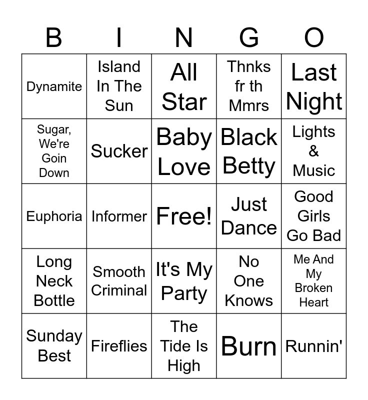 This bingo card has a free space and 39 words: All Right Now, Thunder, Walking On A Dream, Sucker, Sunday Best, It's My Party, Baby Love, Little Bitty Pretty One, Last Night, Long Neck Bottle, Informer, Thnks fr th Mmrs, Runnin', Good Girls Go Bad, Just Dance, Smooth Criminal, Don't Stop Movin', Dynamite, The Sweet Escape, No One Knows, Sugar, We're Goin Down, The Tide Is High, Black Betty, Lights & Music, Best Day Of My Life, Pompeii, On The Floor, It's Time, California Gurls, Island In The Sun, I Gotta Feeling, Down, All Star, Fireflies, Burn, Kiss Me Thru The Phone, Me And My Broken Heart, Euphoria and Crazy.