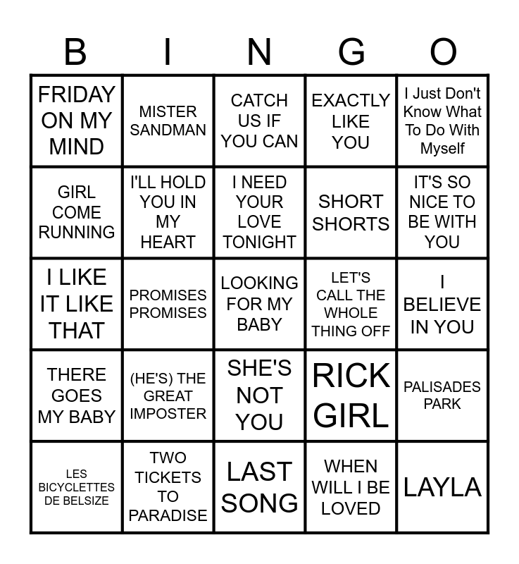 This bingo card has 80 words: BREAK ON THROUGH (TO THE OTHER SIDE), CASTLES IN THE AIR, CATCH US IF YOU CAN, 'CAUSE I LOVE YOU, CINNAMON, CROCODILE ROCK, CRY MYSELF TO SLEEP, DON'T BRING ME DOWN, DON'T GO BREAKING MY HEART, EAGLES FIGHT SONG, EVERYBODY LOVES A LOVER, EVERYDAY WITH YOU GIRL, EXACTLY LIKE YOU, FRIDAY ON MY MIND, FRIENDLY PERSUASION, GIRL COME RUNNING, HE DON'T REALLY LOVE YOU, (HE'S) THE GREAT IMPOSTER, HOT STUFF, I BELIEVE IN YOU, I HEAR A SYMPHONY, I Just Don't Know What To Do With Myself, I LIKE IT LIKE THAT, I NEED YOUR LOVE TONIGHT, I'LL HOLD YOU IN MY HEART, I'LL NEVER FALL IN LOVE AGAIN, I'LL TURN TO STONE, I'M GONNA BE A WHEEL SOMEDAY, IN HEAVEN THERE IS NO BEER, IT ALL DEPENDS ON YOU, IT'S SO NICE TO BE WITH YOU, JEALOUSY, LAST SONG, LAYLA, LES BICYCLETTES DE BELSIZE, LET'S CALL THE WHOLE THING OFF, A LITTLE BIT MORE, LITTLE DARLING, LITTLE TOWN FLIRT, LOOKING FOR MY BABY, LOVE CAME TO ME, LOVE HURTS, LOVE MAKES THE WORLD GO ROUND, LOVERS NEVER SAY GOODBYE, A MAN WITHOUT LOVE, MISTER SANDMAN, NO, NOT MUCH, ON AN EVENING IN ROMA, ON THE RADIO, OPUS 17 (Don't Worry 'Bout Me), PALISADES PARK, PROMISES PROMISES, RICK GIRL, RING AROUND YOUR NECK, ROCKET MAN, SAVE IT FOR ME, SAY YOU LOVE ME, A SECRET LOVE, SHAKE ME, WAKE ME (When It's Over), SHE'S NOT YOU, SHORT SHORTS, SHOUT! SHOUT (KNOCK YOURSELF OUT), SING A SONG, SOMEDAY WE'LL BE TOGETHER, SOMEWHERE THERE'S A SOMEONE, SPACE ODDITY, SWEET DREAMS (ARE MADE OF THIS), TAKE ME AS I AM, TEQUILA SUNRISE, THAT LUCKY OLD SUN, THERE GOES MY BABY, TWO TICKETS TO PARADISE, WAITING FOR A GIRL LIKE YOU, WASTED DAYS & WASTED NIGHTS, WHAT A FOOL BELIEVES, WHAT SHALL I DO?, WHEN WILL I BE LOVED, YES IT'S ME & I'M IN LOVE AGAIN, YOU AND ME (WE WANTED IT ALL) and YOU DROPPED A BOMB ON ME.