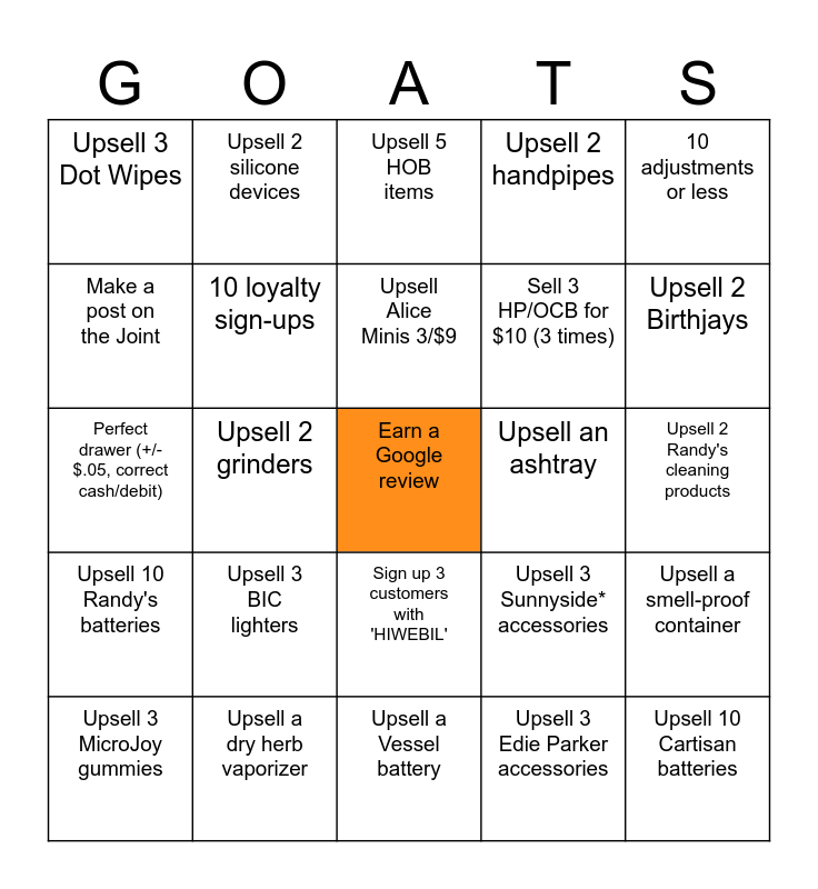 This bingo card has a free space and 24 words: Upsell 3 BIC lighters, Upsell a dry herb vaporizer, Upsell Alice Minis 3/$9, Upsell 3 MicroJoy gummies, 10 adjustments or less, Upsell 3 Dot Wipes, Make a post on the Joint, Upsell 2 silicone devices, Upsell an ashtray, Sign up 3 customers with 'HIWEBIL', Sell 3 HP/OCB for $10 (3 times), Perfect drawer (+/- $.05, correct cash/debit), Upsell 3 Sunnyside* accessories, Upsell a smell-proof container, 10 loyalty sign-ups, Upsell 3 Edie Parker accessories, Upsell 2 Randy's cleaning products, Upsell 5 HOB items, Upsell 2 Birthjays, Upsell 2 grinders, Upsell 10 Cartisan batteries, Upsell 10 Randy's batteries, Upsell 2 handpipes and Upsell a Vessel battery.
