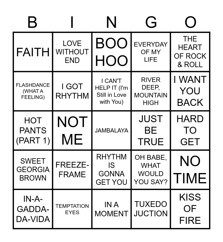 This bingo card has a free space and 79 words: BAD TO THE BONE, BEST THING THAT EVER HAPPENED TO ME, BOO HOO, COTTON JENNY, COUNT ME IN, CRY BABY, DEAD MAN'S CURVE, DIDN'T WE ALMOST HAVE IT ALL, DOCTOR MY EYES, DON'T YOU JUST KNOW IT, EARLY MORNING RAIN, EVERYDAY I HAVE TO CRY, EVERYDAY OF MY LIFE, FAITH, FERRY 'CROSS THE MERSEY, FLASHDANCE (WHAT A FEELING), FOR YOUR PRECIOUS LOVE, FREEZE-FRAME, HANDY MAN, HARD TO GET, HE WILL BREAK YOUR HEART, THE HEART OF ROCK & ROLL, HOT PANTS (PART 1), I CAN'T HELP IT (I'm Still in Love with You), I GOT RHYTHM, I GOT TO USE MY IMAGINATION, I HAD THE CRAZIEST DREAM, I JUST WANNA STOP, I LIKE IT, I STAND ACCUSED, I WANT YOU BACK, I'll Have to Say I Love You in a Song, IN A MOMENT, IN THE MOOD, IN-A-GADDA-DA-VIDA, JUST BE TRUE, JUST ONE LOOK, JUST THE TWO OF US, KEEP ON DANCING, KISS OF FIRE, LADY WILLPOWER, LAUGHING, LEANING ON A LAMPPOST, LOOK THROUGH ANY WINDOW, THE LOVE I LOST, LOVE WITHOUT END, THE LOVE YOU SAVE, MELANCHOLY SERENADE, MY SWEET LORD, NEVER CAN SAY GOODBYE, NO TIME, NOT ME, OH BABE, WHAT WOULD YOU SAY?, ONLY LOVE CAN BREAK A HEART, PEOPLE GET READY, RADAR LOVE, THE RAPPER, RECIPE FOR LOVE, RHINESTONE COWBOY, RHYTHM IS GONNA GET YOU, RIVER DEEP, MOUNTAIN HIGH, ROCK THE BOAT, ROCKIN' AT MIDNIGHT, ROSE MARIE, SINGING THE BLUES, SOONER OR LATER, SOUTHERN NIGHTS, SURE GONNA MISS HER, SWEET BABY JAMES, SWEET GEORGIA BROWN, TEMPTATION EYES, THERE'S A KIND OF HUSH, THIS MAGIC MOMENT, TO BE LOVED, TOWN WITHOUT PITY, TUXEDO JUCTION, WHISPERS (GETTING LOUDER), YOU TELL ME YOUR DREAM and YOU TURN ME ON.