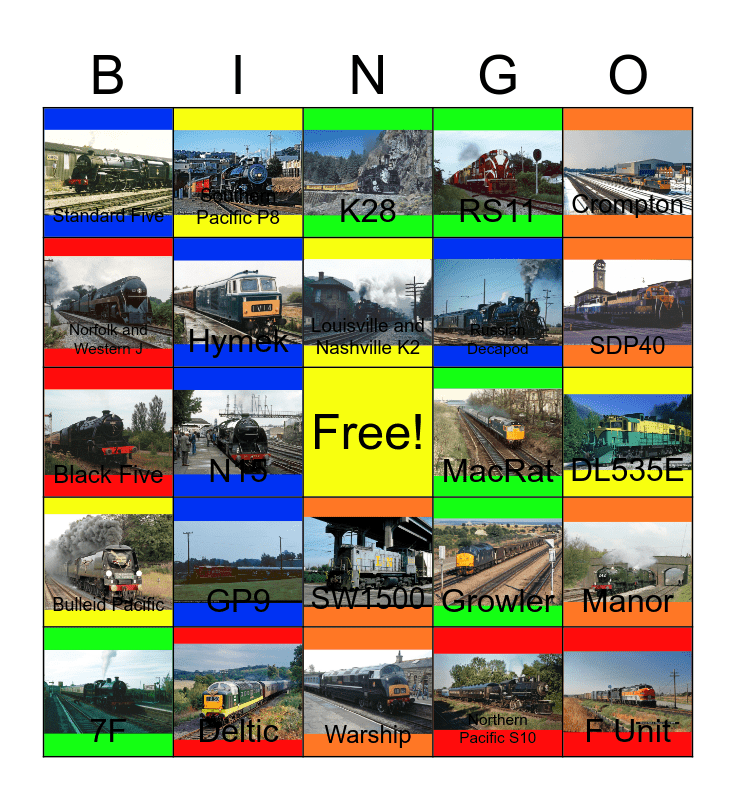 This bingo card has 24 images, a free space and 24 words: GP9, Deltic, Louisville and Nashville K2, 7F, Crompton, Standard Five, Norfolk and Western J, Southern Pacific P8, MacRat, SW1500, Russian Decapod, Black Five, Growler, Manor, Hymek, Northern Pacific S10, DL535E, K28, SDP40, N15, F Unit, Bulleid Pacific, RS11 and Warship.