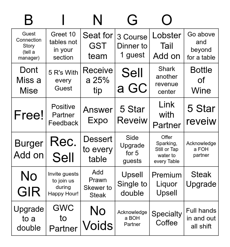 This bingo card has 36 words: Upsell Single to double, Add Prawn Skewer to Steak, Acknowledge a BOH Partner, Dont Miss a Mise, Burger Add on, 5 Star Reveiw, 5 R's With every Guest, No Voids, Lobster Tail Add on, Premium Liquor Upsell, Bottle of Wine, 3 Course Dinner to 1 guest, Steak Upgrade, Positive Partner Feedback, Sell a GC, Guest Connection Story (tell a manager), No GIR, Link with Partner, Free!, Seat for GST team, Answer Expo, Rec. Sell, Side Upgrade for 5 guests, Dessert to every table, Offer Sparking, Still or Tap water to every Table, Greet 10 tables not in your section, Shark another revenue center, GWC to Partner, Receive a 25% tip, Go above and beyond for a table, Full hands in and out all shift, Upgrade to a double, Acknowledge a FOH partner, 5 Star reveiw, Invite guests to join us during Happy Hour! and Specialty Coffee.