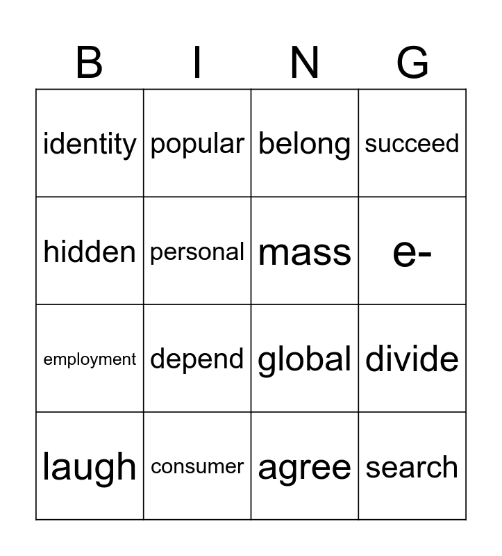 This bingo card has 24 words: Free!, driverless, e-, fake, hidden, identity, personal, popular, consumer, cultural, employment, global, information, ineternational, mass, multinational, agree, belong, depend, divide, laugh, search, succeed and think.
