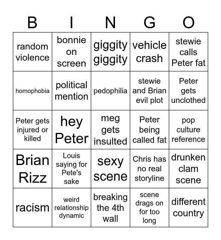This bingo card has a free space and 29 words: racism, hey Louis, hey Peter, irl scene, random violence, giggity giggity, political mention, Louis saying for Pete's sake, Peter being called fat, weird relationship dynamic, pop culture reference, different country, breaking the 4th wall, scene drags on for too long, Peter gets unclothed, super gross scene, sexy scene, Brian Rizz, stewie calls Peter fat, Peter gets injured or killed, Chris has no real storyline, criminal offense, stewie and Brian evil plot, homophobia, vehicle crash, bonnie on screen, drunken clam scene, pedophilia and character gets hurt multiple times.