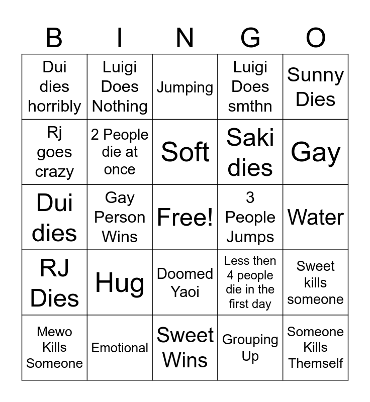 This bingo card has a free space and 24 words: Hug, Emotional, Soft, Mewo Kills Someone, Sunny Dies, Dui dies horribly, Rj goes crazy, Luigi Does Nothing, 3 People Jumps, Doomed Yaoi, Saki dies, Dui dies, Less then 4 people die in the first day, Sweet kills someone, 2 People die at once, Grouping Up, Water, Jumping, Gay, Gay Person Wins, Someone Kills Themself, RJ Dies, Luigi Does smthn and Sweet Wins.