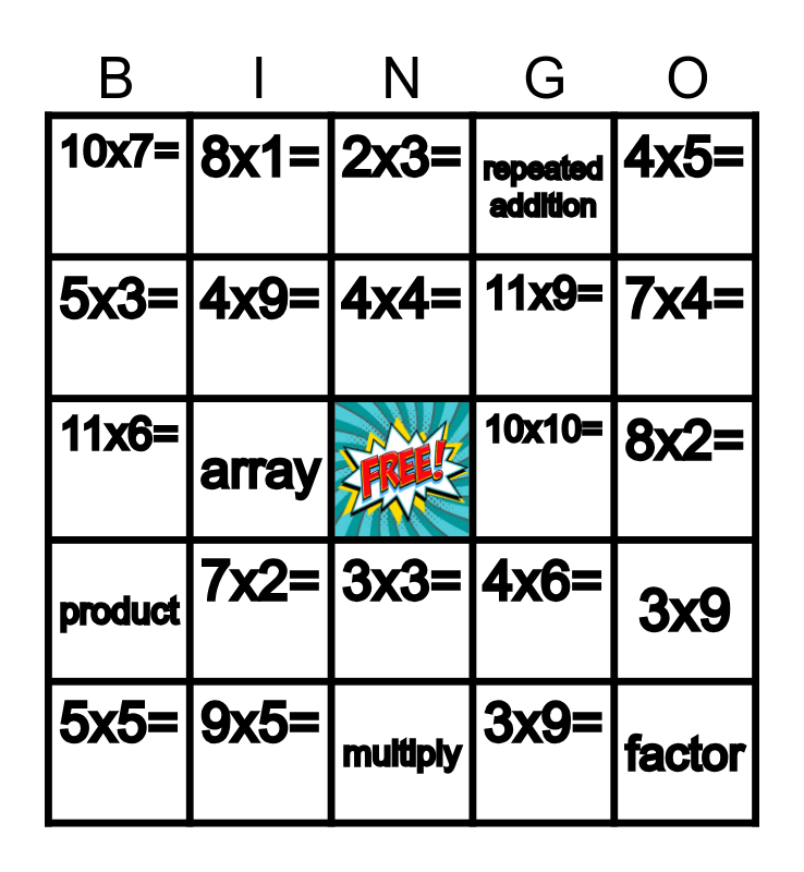 This bingo card has a free space and 24 words: 7x2=, 9x5=, 4x4=, 5x5=, 4x5=, 10x7=, 5x3=, 8x1=, 10x10=, 3x3=, 11x9=, 11x6=, 4x6=, 3x9, 4x9=, 3x9=, 8x2=, 2x3=, 7x4=, array, factor, product, repeated addition and multiply.