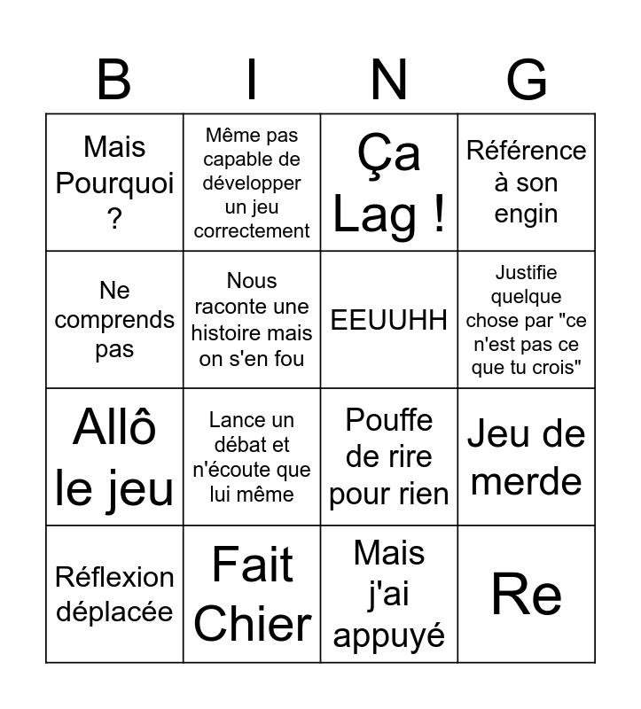 This bingo card has 16 words: Fait Chier, Jeu de merde, Ça Lag !, Mais Pourquoi ?, Allô le jeu, Même pas capable de développer un jeu correctement, Pouffe de rire pour rien, Mais j'ai appuyé, Ne comprends pas, Nous raconte une histoire mais on s'en fou, Réflexion déplacée, Référence à son engin, Lance un débat et n'écoute que lui même, Justifie quelque chose par "ce n'est pas ce que tu crois", EEUUHH and Re.