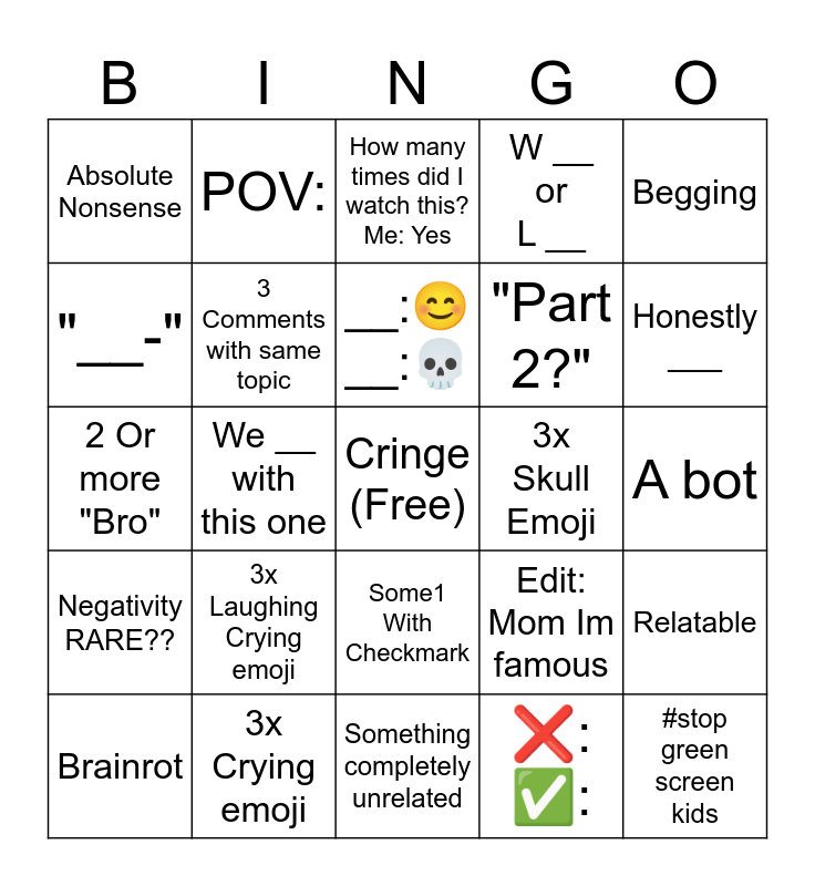 This bingo card has a free space and 24 words: 3x Laughing Crying emoji, 3x Crying emoji, __:😊 __:💀, Brainrot, Begging, Absolute Nonsense, "__-", POV:, 3x Skull Emoji, Some1 With Checkmark, "Part 2?", 2 Or more "Bro", Edit: Mom Im famous, Relatable, 3 Comments with same topic, ❌: ✅:, A bot, How many times did I watch this? Me: Yes, Honestly ___, We __ with this one, #stop green screen kids, Negativity RARE??, W __ or L __ and Something completely unrelated.