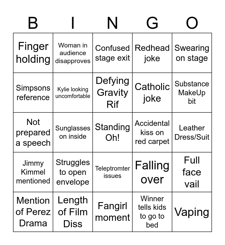 This bingo card has a free space and 24 words: Struggles to open envelope, Length of Film Diss, Defying Gravity Rif, Mention of Perez Drama, Swearing on stage, Finger holding, Simpsons reference, Woman in audience disapproves, Accidental kiss on red carpet, Teleptromter issues, Catholic joke, Not prepared a speech, Falling over, Full face vail, Kylie looking uncomfortable, Winner tells kids to go to bed, Leather Dress/Suit, Confused stage exit, Substance MakeUp bit, Sunglasses on inside, Vaping, Jimmy Kimmel mentioned, Redhead joke and Fangirl moment.