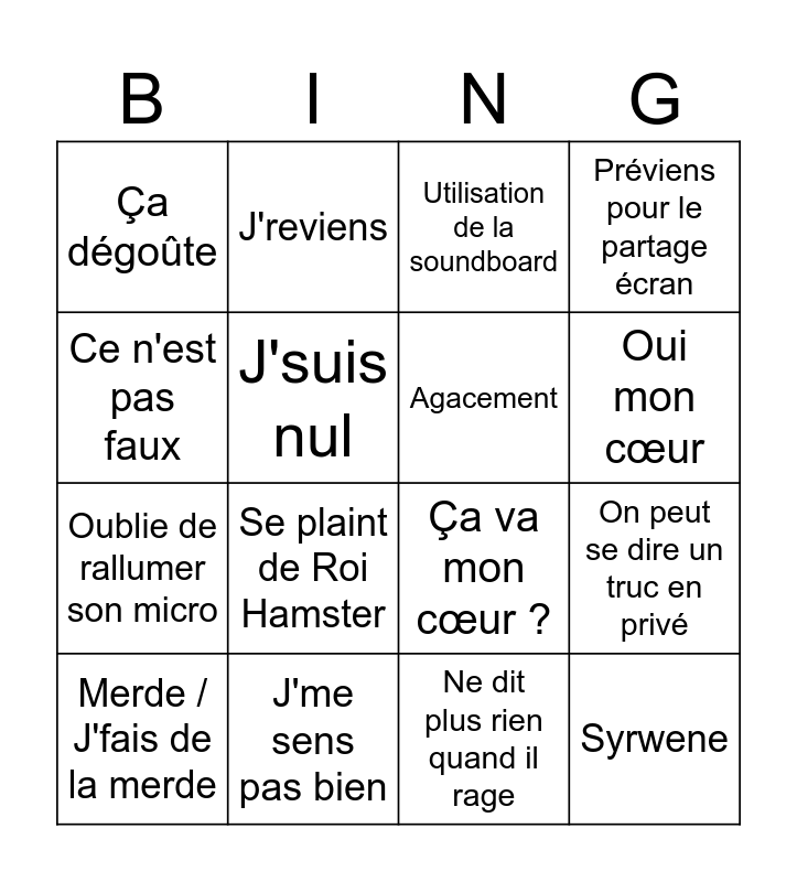 This bingo card has 16 words: J'me sens pas bien, On peut se dire un truc en privé, Utilisation de la soundboard, Ça dégoûte, Oublie de rallumer son micro, J'reviens, Ça va mon cœur ?, Ne dit plus rien quand il rage, Ce n'est pas faux, J'suis nul, Merde / J'fais de la merde, Préviens pour le partage écran, Se plaint de Roi Hamster, Oui mon cœur, Agacement and Syrwene.
