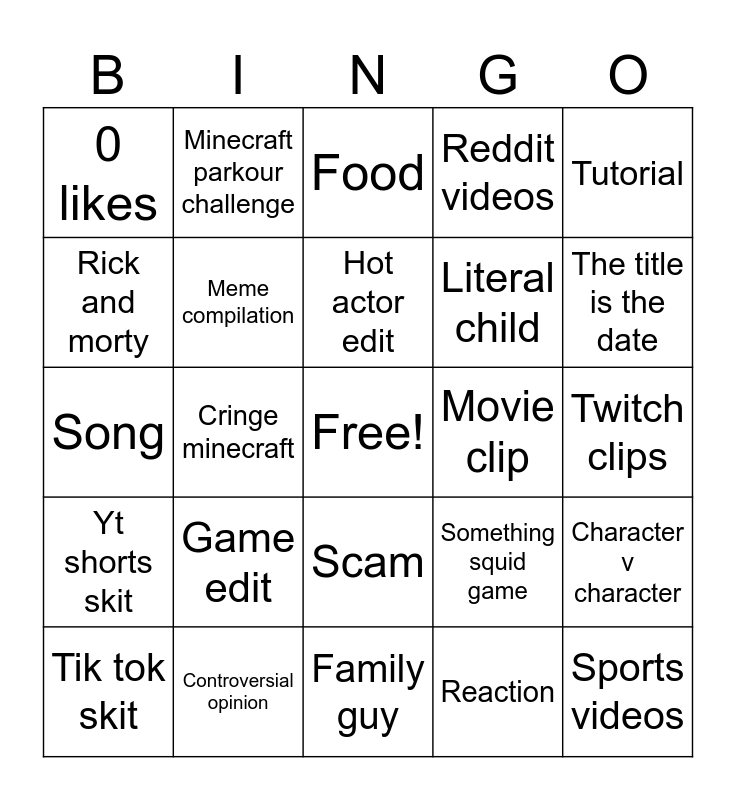 This bingo card has a free space and 24 words: Game edit, Controversial opinion, Hot actor edit, Tik tok skit, Tutorial, 0 likes, Rick and morty, Minecraft parkour challenge, Movie clip, Scam, Literal child, Song, Something squid game, Character v character, Meme compilation, Reaction, Twitch clips, Food, The title is the date, Cringe minecraft, Sports videos, Yt shorts skit, Reddit videos and Family guy.