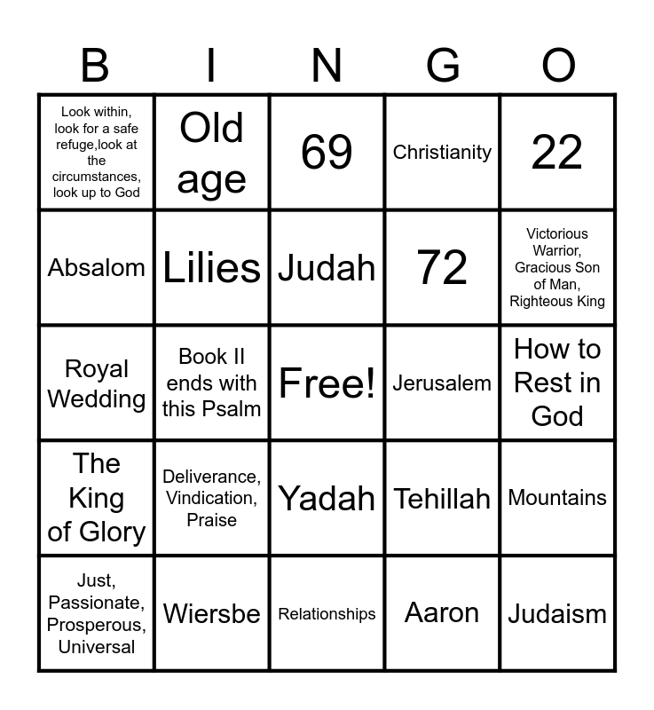 This bingo card has a free space and 33 words: Short hymn of Praise that ends each book, Wealth, Book II ends with this Psalm, The Sons of Korah, The King of Glory, Lilies, 22, Just, Passionate, Prosperous, Universal, Old age, Ahitophel, Judah, 69, 7 Words of Praise, Cleanse, Restore, Use, Jerusalem, Victorious Warrior, Gracious Son of Man, Righteous King, Wiersbe, Royal Wedding, Deliverance, Vindication, Praise, Tehillah, Yadah, Book II begins with this Psalm, Look within, look for a safe refuge,look at the circumstances, look up to God, How to Rest in God, Relationships, Judaism, Christianity, 72, Absalom, Mountains, 1, Aaron and Islam.