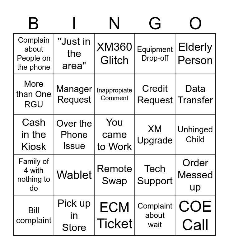 This bingo card has a free space and 29 words: Bill complaint, XM, Over the Phone Issue, Return Equipment, Complain about People on the phone, XM360 Glitch, Manager Request, Wablet, XM Upgrade, Pick up in Store, Unhinged Child, COE Call, ECM Ticket, Complaint about wait, Data Transfer, HSD Sale, Remote Swap, Family of 4 with nothing to do, Elderly Person, Cash in the Kiosk, Tech Support, NOW Issue, Credit Request, More than One RGU, Equipment Drop-off, "Just in the area", Order Messed up, Inappropiate Comment and "I've been a customer for... ".