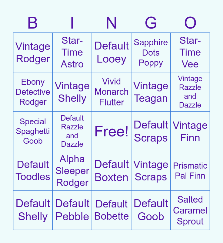 This bingo card has a free space and 88 words: Cloudy Dream Boxten, Vintage Boxten, Default Boxten, Antique Shade Brightney, Vintage Brightney, Default Brightney, Frosty Mittens Connie, Vintage Connie, Default Connie, Caramel Drizzle Cosmo, Vintage Cosmo, Default Cosmo, Prismatic Pal Finn, Vintage Finn, Default Finn, Vivid Monarch Flutter, Vintage Flutter, Default Flutter, Rainy Day Gigi, Vintage Gigi, Default Gigi, Fun Partygoer Goob, Special Spaghetti Goob, Vintage Goob, Default Goob, Cozy Sweater Glisten, Vintage Glisten, Default Glisten, Dapperly Festive Looey, Vintage Looey, Default Looey, Sapphire Dots Poppy, Vintage Poppy, Default Poppy, Alpha Sleeper Rodger, Ebony Detective Rodger, Vintage Rodger, Default Rodger, Seafoam Razzle and Dazzle, Vintage Razzle and Dazzle, Default Razzle and Dazzle, Cutesy Calico Scraps, Pastel Paper Scraps, Vintage Scraps, Default Scraps, Dark Spikes Shrimpo, Vintage Shrimpo, Default Shrimpo, Purple Elegance Teagan, Vintage Teagan, Default Teagan, Lavender Maid Tisha, Vintage Tisha, Default Tisha, Junior Detective Toodles, Vintage Toodles, Default Toodles, Star-Time Astro, Starry Night Astro, Vintage Astro, Default Astro, Loyal Bud Pebble, Thorned Geode Pebble, Star-Time Pebble, Vintage Pebble, Default Pebble, Dino Snore Shelly, Vintage Shelly, Default Shelly, Salted Caramel Sprout, Vintage Sprout, Default Sprout, Cosmic Signal Vee, Star-Time Vee, Vintage Vee, Default Vee, Eve Sleeper Bobette, Vintage Bobette, Default Bobette, Pretty Present Coal, Vintage Coal, Default Coal, Minty Pine Ginger, Vintage Ginger, Default Ginger, Blue Bell Rudie, Vintage Rudie and Default Rudie.