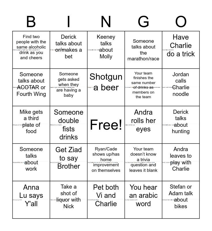 This bingo card has 23 images, a free space and 24 words: Get Ziad to say Brother, Take a shot of liquor with Nick, Shotgun a beer, Anna Lu says Y'all, Have Charlie do a trick, Find two people with the same alcoholic drink as you and cheers, Someone talks about ACOTAR or Fourth Wing, Derick talks about or/makes a bet, Andra rolls her eyes, Ryan/Cade shows up/has home improvement on themselves, Your team finishes the same number of drinks as members on the team, Mike gets a third plate of food, Your team doesn’t know a trivia question and leaves it blank, Andra leaves to play with Charlie, Someone gets asked when they are having a baby, You hear an arabic word, Derick talks about hunting, Keeney talks about Molly, Jordan calls Charlie noodle, Someone double fists drinks, Stefan or Adam talk about bikes, Someone talks about work, Someone talks about the marathon/race and Pet both Vi and Charlie.