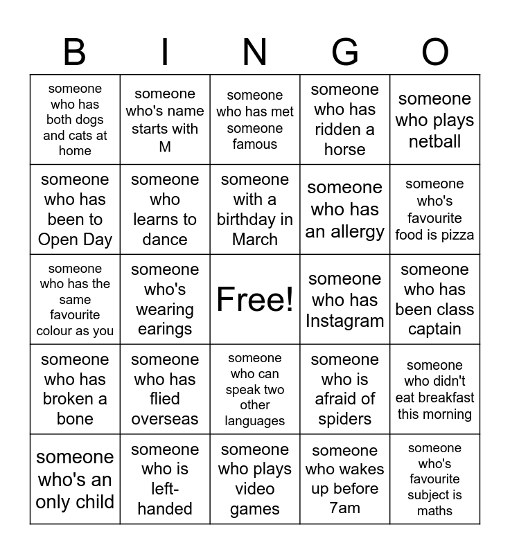This bingo card has a free space and 29 words: someone who wears glasses, someone who is left-handed, someone who has met someone famous, someone who likes Marvel movies, someone who plays netball, someone who has both dogs and cats at home, someone who learns to dance, someone with a birthday in March, someone who has Instagram, someone who didn't eat breakfast this morning, someone who's an only child, someone who's wearing earings, someone who wakes up before 7am, someone who's favourite subject is maths, someone who has the same favourite colour as you, someone who has a brother, someone who plays video games, someone who is afraid of spiders, someone who's favourite food is pizza, someone who has broken a bone, someone who has flied overseas, someone who is Year 4-6, someone who has an allergy, someone who has been class captain, someone who has been to Open Day, someone who's name starts with M, someone who can speak two other languages, someone who has ridden a horse and someone who has blue eyes.