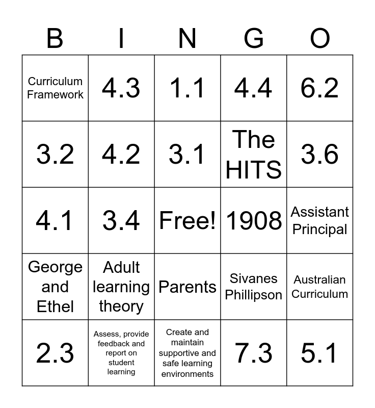 This bingo card has a free space and 74 words: 1.2, 1.3, 1.1, 1.4, 1.5, 1.6, 2.1, 2.2, 2.3, 2.4, 2.5, 2.6, 3.1, 3.2, 3.3, 3.4, 3.5, 3.6, 3.7, 4.1, 4.2, 4.3, 4.4, 4.5, 5.1, 5.2, 5.3, 5.4, 5.5, 6.1, 6.2, 6.3, 6.4, 7.1, 7.2, 7.3, 7.4, Know students and how they learn, Know the content and how to teach it, Plan for and implement effective teaching and learning, Create and maintain supportive and safe learning environments, Assess, provide feedback and report on student learning, Engage in professional learning, Engage professionally with colleagues, parents/carers and the community, Curriculum, Curriculum Framework, The teaching of children, Adult learning theory, Explicit, Inquiry, Principal, Learning Specialist, Assistant Principal, Professional Knowledge, Professional Practice, Professional Engagement, Parents, The Department of Education Vic, Australian Professional Standards for Teachers, Australian Curriculum, The HITS, FISO, George and Ethel, Eastern Suburbs Technical College, 1908, 1992, 1968, Pascale Quester, Sivanes Phillipson, Steven Murdoch, James Verdon, School of Social Sciences, Media, Film and Education, Professional Development and Critical Reflection.