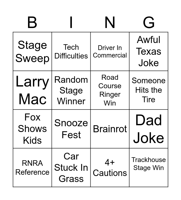 This bingo card has 16 words: Car Stuck In Grass, Dad Joke, Driver In Commercial, Stage Sweep, Fox Shows Kids, Tech Difficulties, Brainrot, 4+ Cautions, Larry Mac, Random Stage Winner, RNRA Reference, Awful Texas Joke, Snooze Fest, Someone Hits the Tire, Road Course Ringer Win and Trackhouse Stage Win.