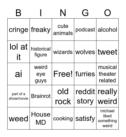This bingo card has a free space and 24 words: Brainrot, House MD, wizards, weed, alcohol, cringe, lol at it, freaky, furries, old rock, wolves, ai, reddit story, really weird, historical figure, satisfy, musical theater related, cute animals, tweet, weird eye guys, michael liked something weird, part of a show/movie, podcast and cooking.