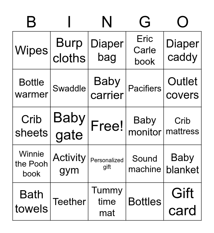 This bingo card has a free space and 25 words: Activity gym, Tummy time mat, Baby carrier, Bath towels, Diaper caddy, Wipes, Bottle warmer, Burp cloths, Baby monitor, Personalized gift, Pacifiers, Crib sheets, Sound machine, Baby blanket, Swaddle, Crib, Crib mattress, Diaper bag, Outlet covers, Baby gate, Gift card, Teether, Winnie the Pooh book, Eric Carle book and Bottles.