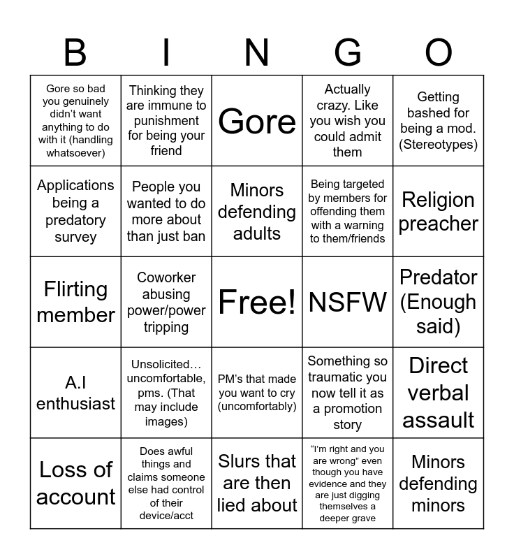This bingo card has a free space and 24 words: Unsolicited… uncomfortable, pms. (That may include images), Does awful things and claims someone else had control of their device/acct, Minors defending adults, Loss of account, Getting bashed for being a mod. (Stereotypes), Gore so bad you genuinely didn’t want anything to do with it (handling whatsoever), Applications being a predatory survey, Thinking they are immune to punishment for being your friend, NSFW, PM’s that made you want to cry (uncomfortably), Being targeted by members for offending them with a warning to them/friends, Flirting member, Something so traumatic you now tell it as a promotion story, Direct verbal assault, People you wanted to do more about than just ban, “I’m right and you are wrong” even though you have evidence and they are just digging themselves a deeper grave, Predator (Enough said), Gore, Religion preacher, Coworker abusing power/power tripping, Minors defending minors, A.I enthusiast, Actually crazy. Like you wish you could admit them and Slurs that are then lied about.