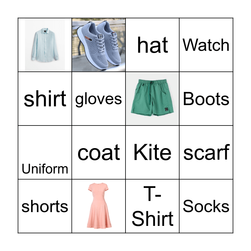This bingo card has 4 images and 20 words: Slippers, Sweater, T-Shirt, Socks, Watch, Uniform, Jacket, Boots, hat, Mittens, Kite, Helmet, shorts, gloves, pajamas, scarf, shirt, coat, hat and jacket.