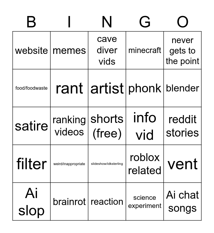 This bingo card has a free space and 24 words: weird/inappropriate, brainrot, artist, Ai slop, never gets to the point, website, food/foodwaste, memes, info vid, slideshow/idksterling, phonk, satire, roblox related, vent, rant, science experiment, reddit stories, cave diver vids, blender, ranking videos, Ai chat songs, filter, minecraft and reaction.