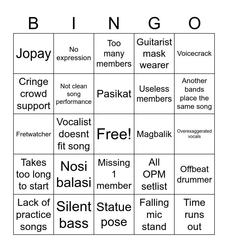 This bingo card has a free space and 36 words: 1 mainstream eraserhead song, Another band covering eraserheads, Switching musicians, Not clean song performance, All OPM setlist, Takes too long to start, Pasikat, Starts intro with "Hey guys!!1", Voicecrack, Cringe crowd hyper, Vocalist doesnt fit song, Guitarist mask wearer, Curly hair guitarist, Magbalik, Another bands place the same song, Jopay, Beer, Nosi balasi, Time runs out, Too many members, Overexaggerated vocals, Offbeat drummer, Silent bass, Lack of practice songs, Statue pose, No expression, Fretwatcher, Too many vocalists, Useless members, Cringe crowd support, No donations at all, Flying drumstick, Falling mic stand, Missing 1 member, Cringe crowd interaction and Low volume vocalist.