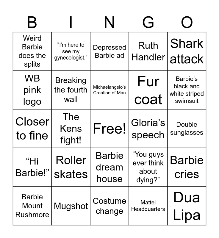 This bingo card has a free space and 24 words: Roller skates, Mugshot, Michaelangelo's Creation of Man, Barbie Mount Rushmore, Shark attack, Weird Barbie does the splits, WB pink logo, "I'm here to see my gynecologist.", Gloria’s speech, Barbie dream house, Fur coat, Closer to fine, “You guys ever think about dying?”, Barbie cries, Breaking the fourth wall, Mattel Headquarters, Double sunglasses, Depressed Barbie ad, Barbie's black and white striped swimsuit, The Kens fight!, Dua Lipa, “Hi Barbie!”, Ruth Handler and Costume change.
