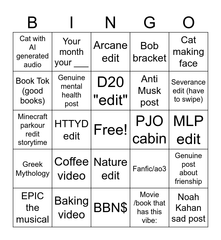 This bingo card has a free space and 24 words: Coffee video, Baking video, D20 "edit", EPIC the musical, Cat making face, Cat with AI generated audio, Book Tok (good books), Your month your ___, PJO cabin, Nature edit, Anti Musk post, Minecraft parkour redit storytime, Fanfic/ao3, Genuine post about frienship, Genuine mental health post, Movie /book that has this vibe:, MLP edit, Arcane edit, Severance edit (have to swipe), HTTYD edit, Noah Kahan sad post, Greek Mythology, Bob bracket and BBN$.