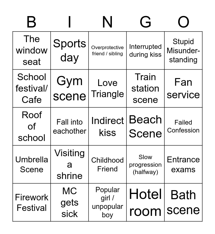 This bingo card has a free space and 24 words: Visiting a shrine, MC gets sick, Love Triangle, Firework Festival, Stupid Misunder- standing, The window seat, School festival/ Cafe, Sports day, Beach Scene, Childhood Friend, Train station scene, Roof of school, Slow progression (halfway), Entrance exams, Gym scene, Hotel room, Failed Confession, Overprotective friend / sibling, Fan service, Fall into eachother, Bath scene, Umbrella Scene, Interrupted during kiss and Popular girl / unpopular boy.