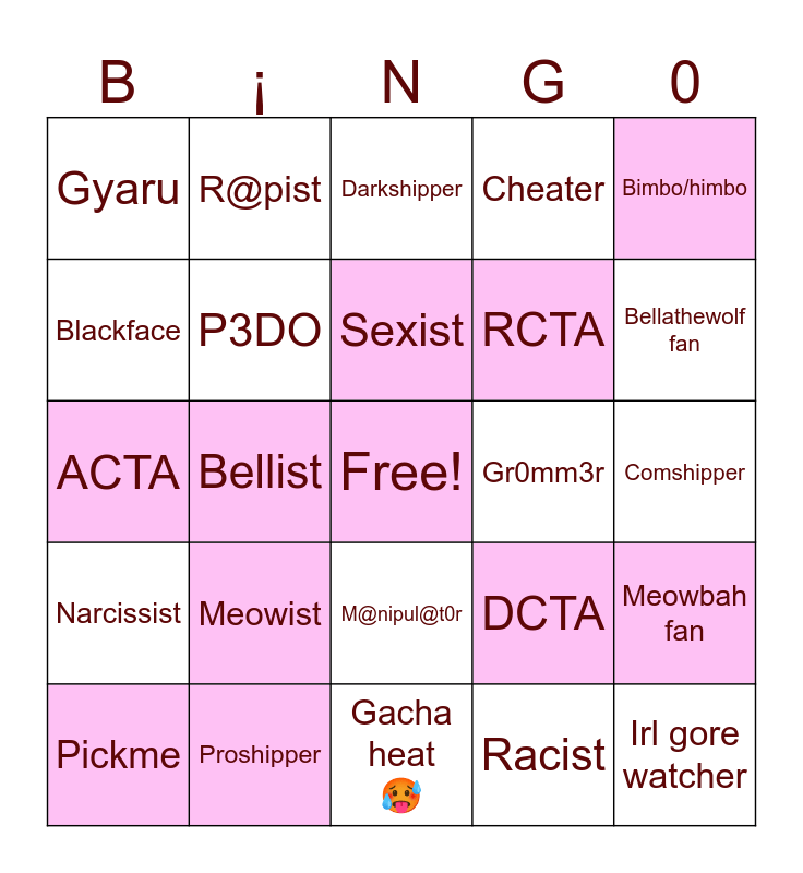 This bingo card has a free space and 24 words: Meowist, Proshipper, Sexist, Pickme, Bimbo/himbo, Gyaru, Blackface, R@pist, Gr0mm3r, M@nipul@t0r, RCTA, ACTA, DCTA, Meowbah fan, P3DO, Racist, Comshipper, Darkshipper, Bellathewolf fan, Bellist, Irl gore watcher, Narcissist, Cheater and Gacha heat 🥵.