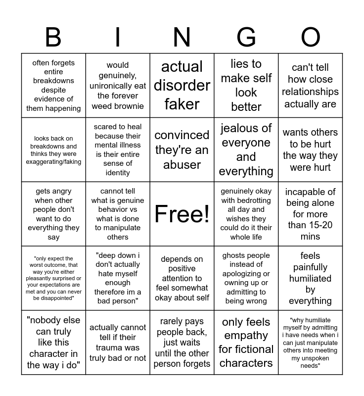 This bingo card has a free space and 24 words: "deep down i don't actually hate myself enough therefore im a bad person", actually cannot tell if their trauma was truly bad or not, convinced they're an abuser, "nobody else can truly like this character in the way i do", can't tell how close relationships actually are, often forgets entire breakdowns despite evidence of them happening, looks back on breakdowns and thinks they were exaggerating/faking, would genuinely, unironically eat the forever weed brownie, genuinely okay with bedrotting all day and wishes they could do it their whole life, depends on positive attention to feel somewhat okay about self, jealous of everyone and everything, gets angry when other people don't want to do everything they say, ghosts people instead of apologizing or owning up or admitting to being wrong, feels painfully humiliated by everything, scared to heal because their mental illness is their entire sense of identity, only feels empathy for fictional characters, incapable of being alone for more than 15-20 mins, actual disorder faker, wants others to be hurt the way they were hurt, cannot tell what is genuine behavior vs what is done to manipulate others, "why humiliate myself by admitting i have needs when i can just manipulate others into meeting my unspoken needs", "only expect the worst outcome, that way you're either pleasantly surprised or your expectations are met and you can never be disappointed", lies to make self look better and rarely pays people back, just waits until the other person forgets.
