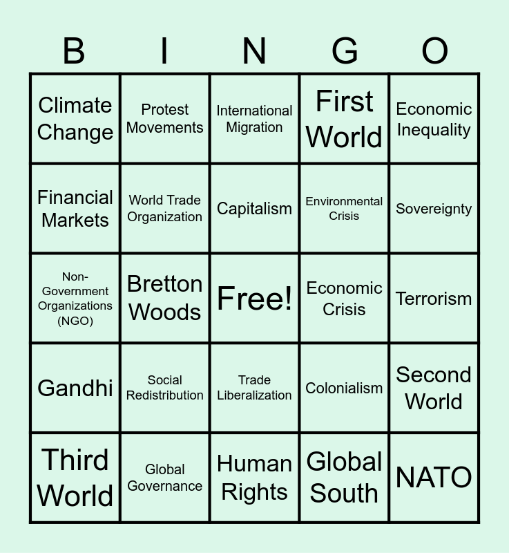 This bingo card has a free space and 30 words: Global Governance, United Nations (UN), Bretton Woods, Peace and Security, Climate Change, International Migration, World Trade Organization, Trade Liberalization, Economic Crisis, Human Rights, Terrorism, NATO, Global South, Global North, Sovereignty, Intergovernmental Organizations, Colonialism, Gandhi, Social Redistribution, Economic Inequality, Non-Government Organizations (NGO), Neoliberalism, Protest Movements, Environmental Crisis, Financial Markets, First World, Second World, Third World, Capitalism and International Monetary Fund (IMF).
