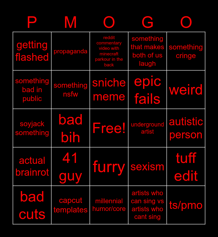 This bingo card has a free space and 39 words: somebody dying, reddit meme, food, something nsfw, bad cuts, furry, sniche meme, opium related, something cringe, actual brainrot, bad bih, something that makes both of us laugh, ts/pmo, autistic person, underground artist, 41 guy, streamer clips, getting flashed, racist, sexism, something bad in public, millennial humor/core, epic fails, weird, ai video, white person saying the n word, something extremely unfunny, chopped, bad fits, propaganda, zach d films, family guy clip, reddit commentary video with minecraft parkour in the back, capcut templates, artists who can sing vs artists who cant sing, things that dont make sense, tuff edit, soyjack something and lil uzi vert.