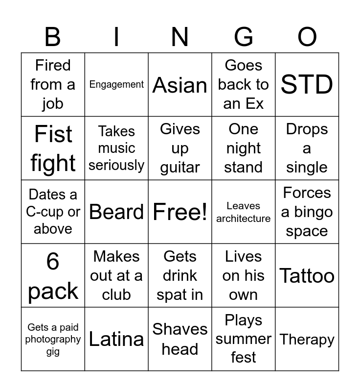 This bingo card has a free space and 24 words: Makes out at a club, Latina, Gives up guitar, Gets a paid photography gig, STD, Fired from a job, Fist fight, Engagement, Leaves architecture, Gets drink spat in, One night stand, Dates a C-cup or above, Lives on his own, Tattoo, Takes music seriously, Plays summer fest, Forces a bingo space, Asian, Drops a single, Beard, Therapy, 6 pack, Goes back to an Ex and Shaves head.