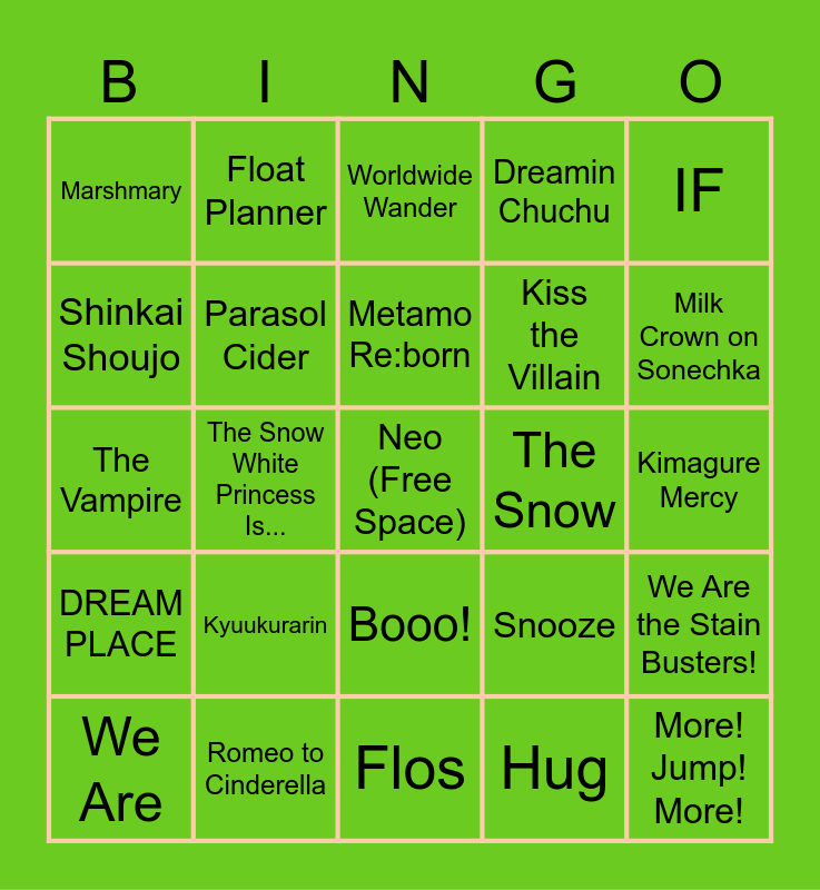 This bingo card has a free space and 24 words: Kyuukurarin, Romeo to Cinderella, Metamo Re:born, We Are, IF, Marshmary, Shinkai Shoujo, Float Planner, The Snow, Booo!, Kiss the Villain, The Vampire, Snooze, We Are the Stain Busters!, Parasol Cider, Hug, Kimagure Mercy, Worldwide Wander, Milk Crown on Sonechka, The Snow White Princess Is..., More! Jump! More!, DREAM PLACE, Dreamin Chuchu and Flos.