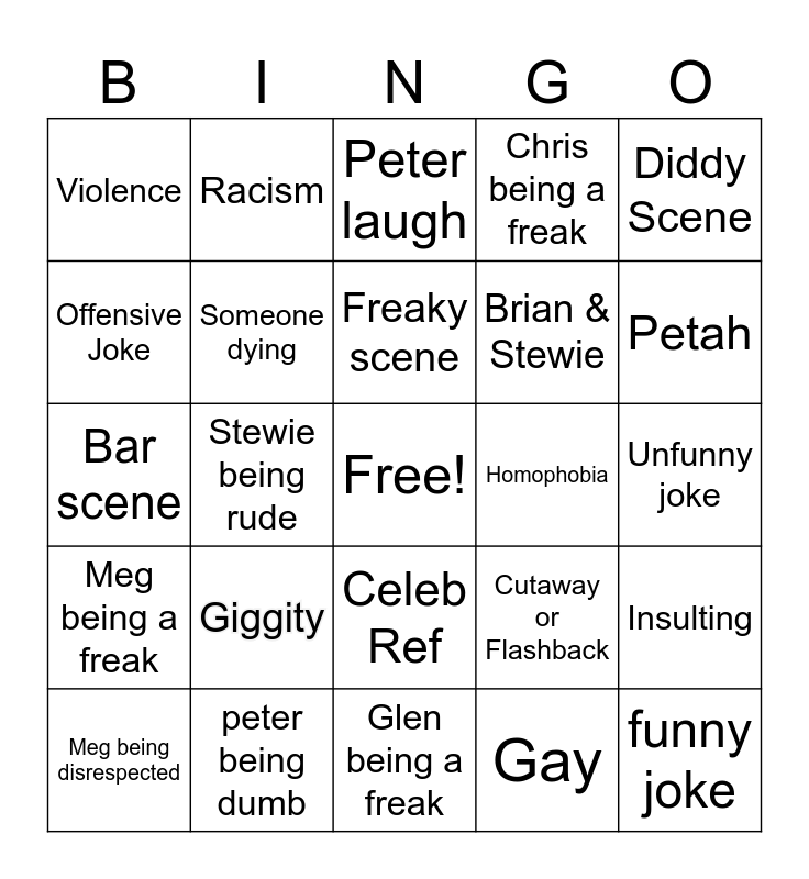 This bingo card has a free space and 24 words: Giggity, peter being dumb, Freaky scene, Meg being disrespected, Diddy Scene, Violence, Offensive Joke, Racism, Homophobia, Celeb Ref, Brian & Stewie, Bar scene, Cutaway or Flashback, Insulting, Someone dying, Gay, Unfunny joke, Peter laugh, Petah, Stewie being rude, funny joke, Meg being a freak, Chris being a freak and Glen being a freak.