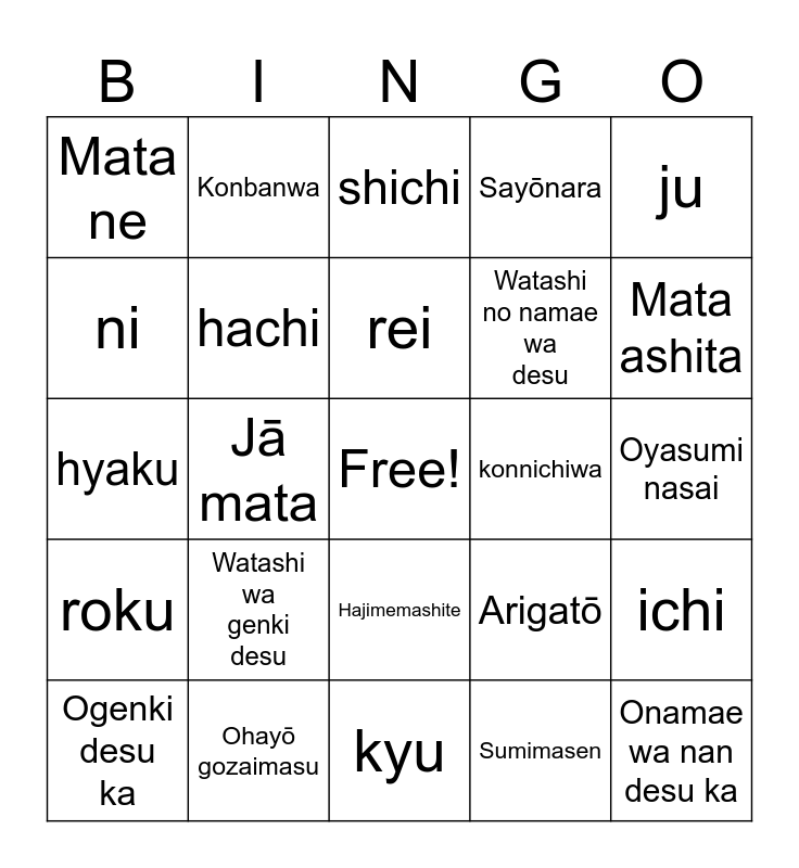 This bingo card has a free space and 24 words: Watashi wa genki desu, Ohayō gozaimasu, rei, Ogenki desu ka, ju, Mata ne, ni, Konbanwa, konnichiwa, Hajimemashite, Watashi no namae wa desu, hyaku, Arigatō, ichi, hachi, Sumimasen, Oyasumi nasai, shichi, Mata ashita, Jā mata, Onamae wa nan desu ka, roku, Sayōnara and kyu.