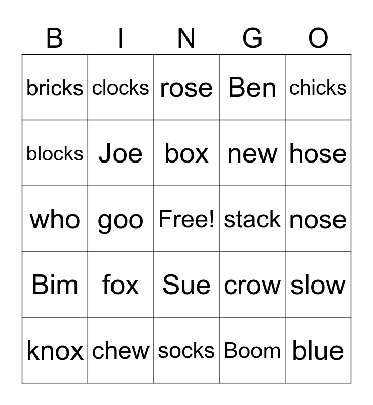 This bingo card has a free space and 25 words: fox, socks, box, knox, chicks, bricks, blocks, clocks, stack, Sue, new, who, crow, slow, Joe, clothes, nose, rose, hose, goo, blue, chew, Bim, Ben and Boom.