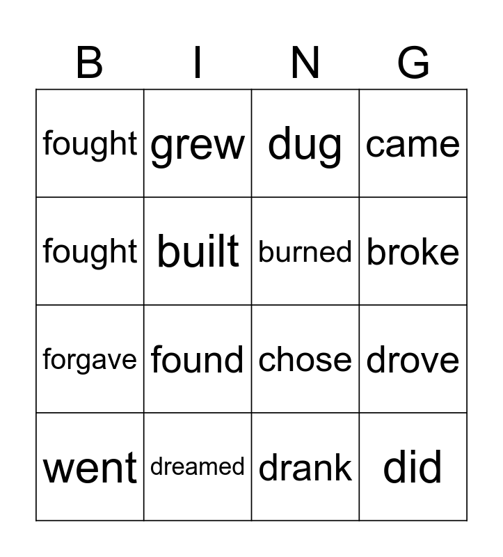 This bingo card has 35 words: bit, bled, blew, broke, brought, built, burned, bought, fought, caught, chose, came, cost, cut, dug, did, drew, dreamed, drank, drove, ate, fell, fed, felt, fought, found, flew, forgot, forgave, froze, got, gave, went, grew and hanged.