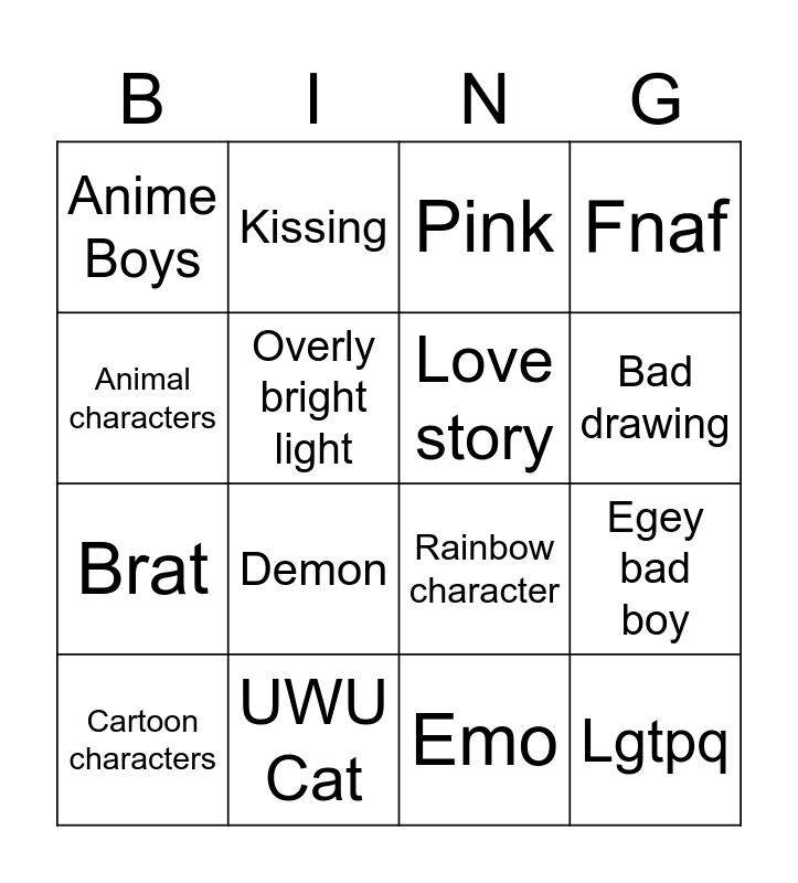 This bingo card has 16 words: UWU Cat, Egey bad boy, Pink, Anime Boys, Brat, Kissing, Rainbow character, Emo, Animal characters, Overly bright light, Cartoon characters, Fnaf, Demon, Bad drawing, Love story and Lgtpq.