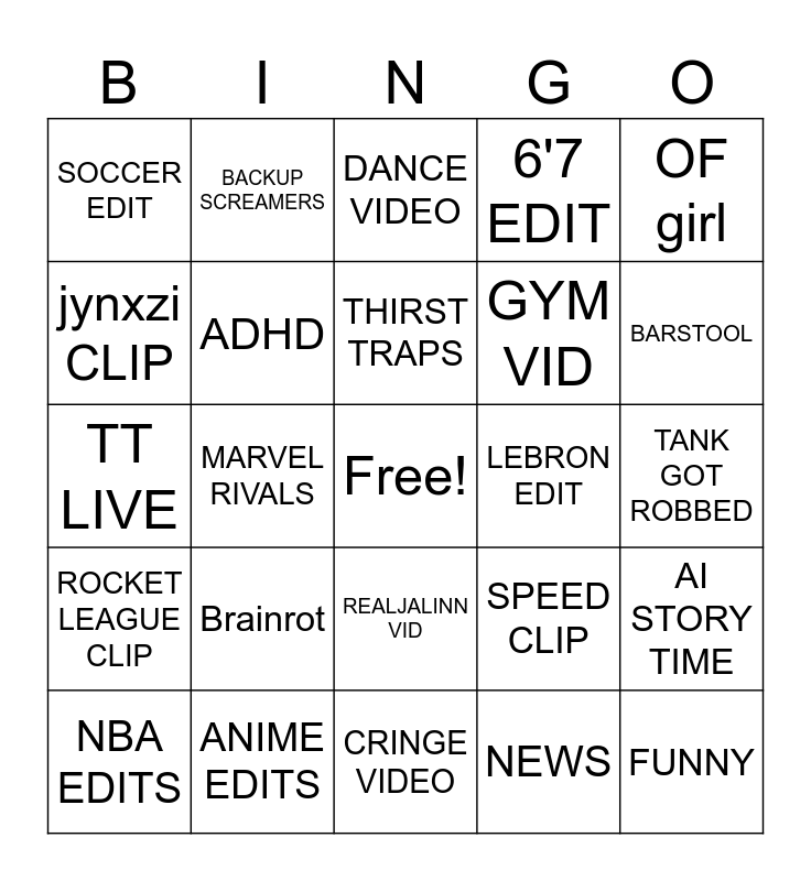 This bingo card has a free space and 24 words: Brainrot, ANIME EDITS, THIRST TRAPS, NBA EDITS, OF girl, SOCCER EDIT, jynxzi CLIP, BACKUP SCREAMERS, LEBRON EDIT, REALJALINN VID, GYM VID, TT LIVE, SPEED CLIP, AI STORY TIME, ADHD, NEWS, TANK GOT ROBBED, DANCE VIDEO, BARSTOOL, MARVEL RIVALS, FUNNY, ROCKET LEAGUE CLIP, 6'7 EDIT and CRINGE VIDEO.